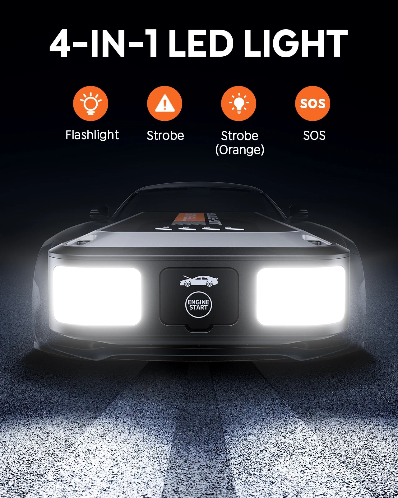 - 4-in-1 Funkcionalumas– jump starteris, power bank, LED žibintuvėlis ir avarinė signalizacija