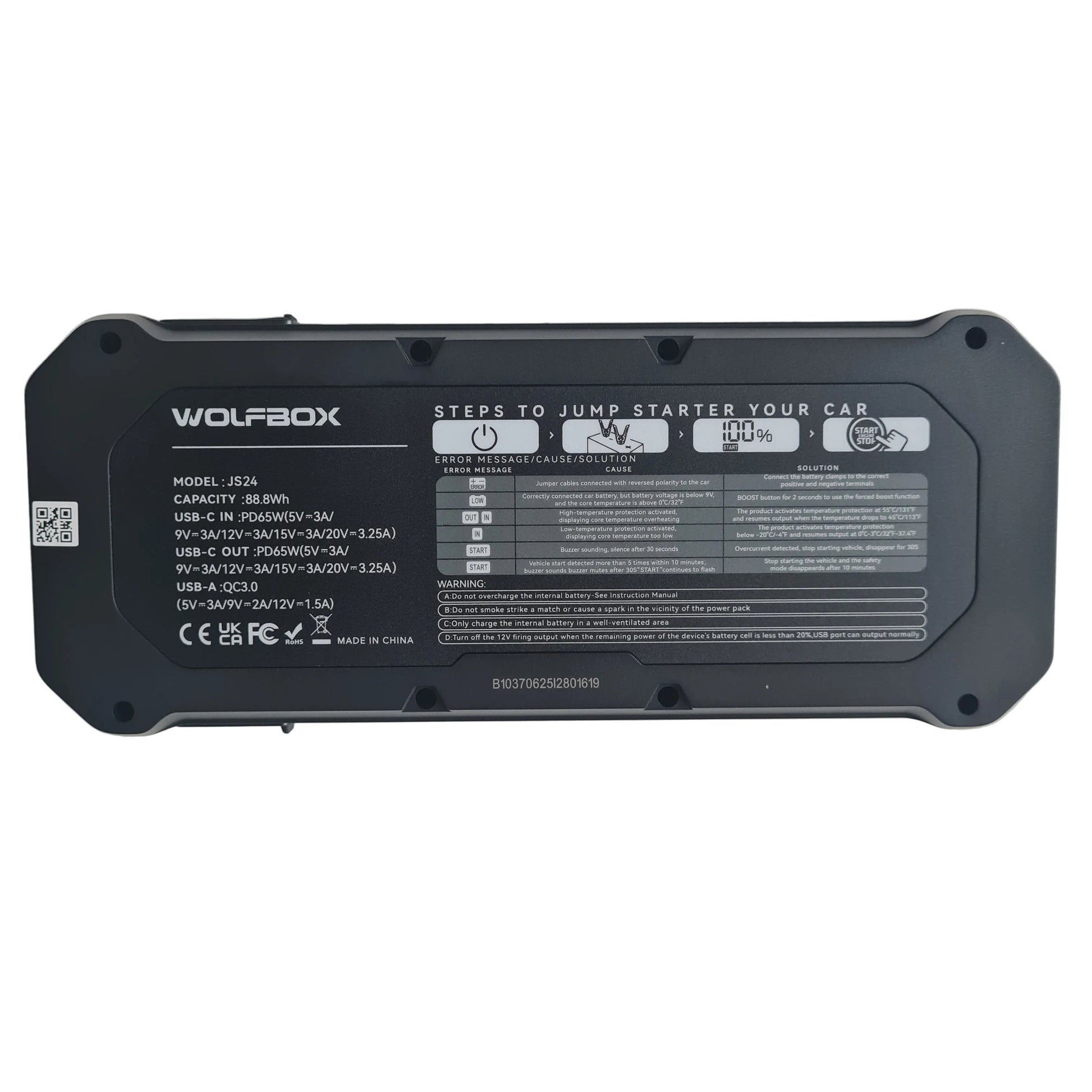 WOLFBOX JS24 Jump Starteris – tai patikimas pagalbininkas, kuris visada bus po ranka, kai labiausiai reikės. Nesvarbu, ar esate kelyje, ar namuose, šis įrenginys užtikrins, kad jūsų automobilis bus užvestas greitai ir saugiai.